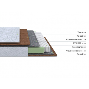 В качестве наполнителя используется увеличенный слой натуральной кокосовой койры, которая придает поверхности высокую жесткость и плотность, является очень прочным и долговечным материалом. Слой современного материала ORTO FOAM усиливает анатомические свойства матраса, помогает принять удобное положение тела для максимального расслабления во время сна и отдыха.